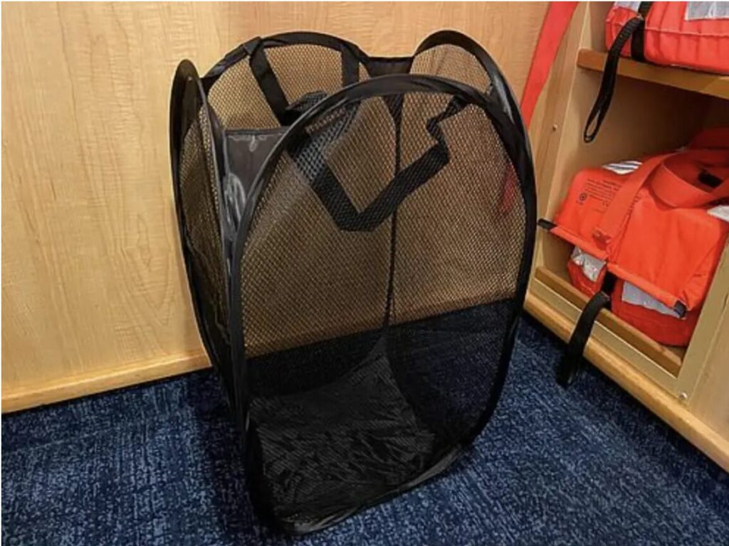 - A foldable laundry basket or a large garbage bag allows you to keep dirty clothes organized, preventing your cabin from being littered with used clothing later in the trip.